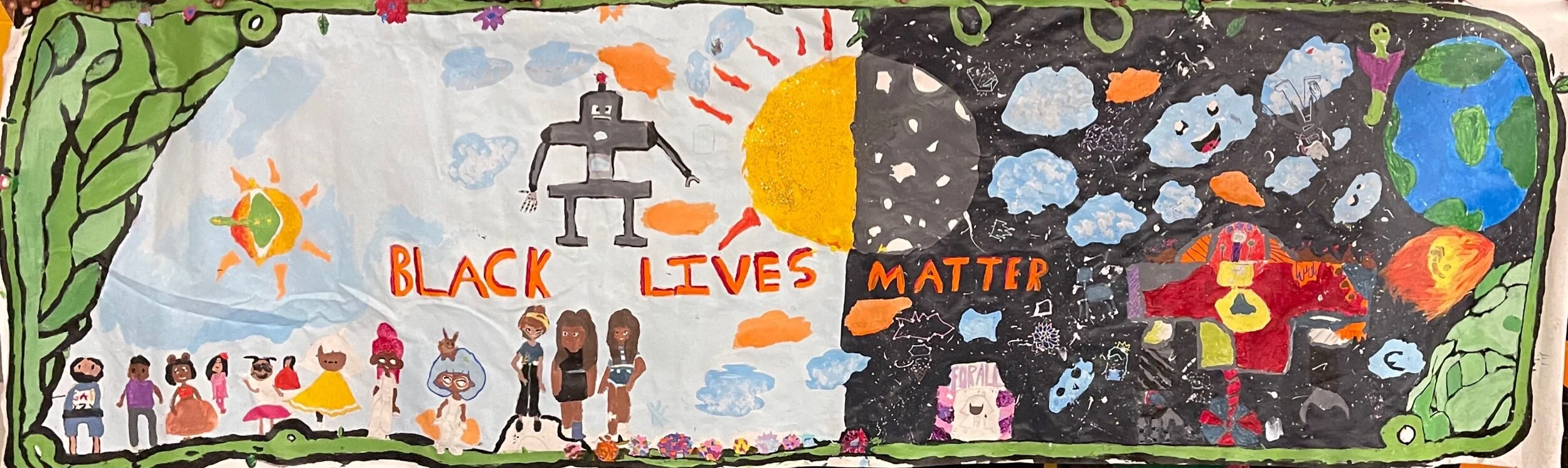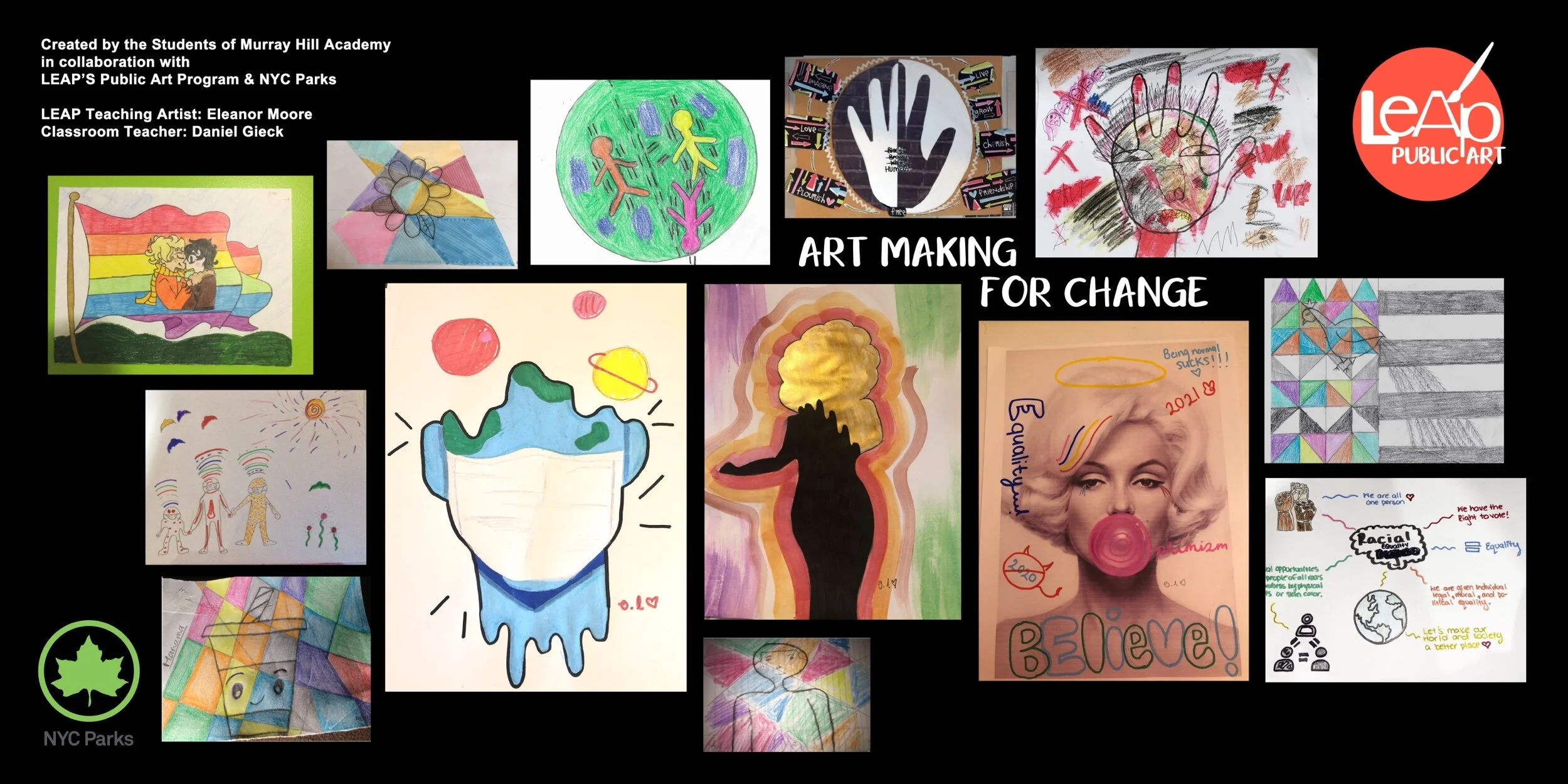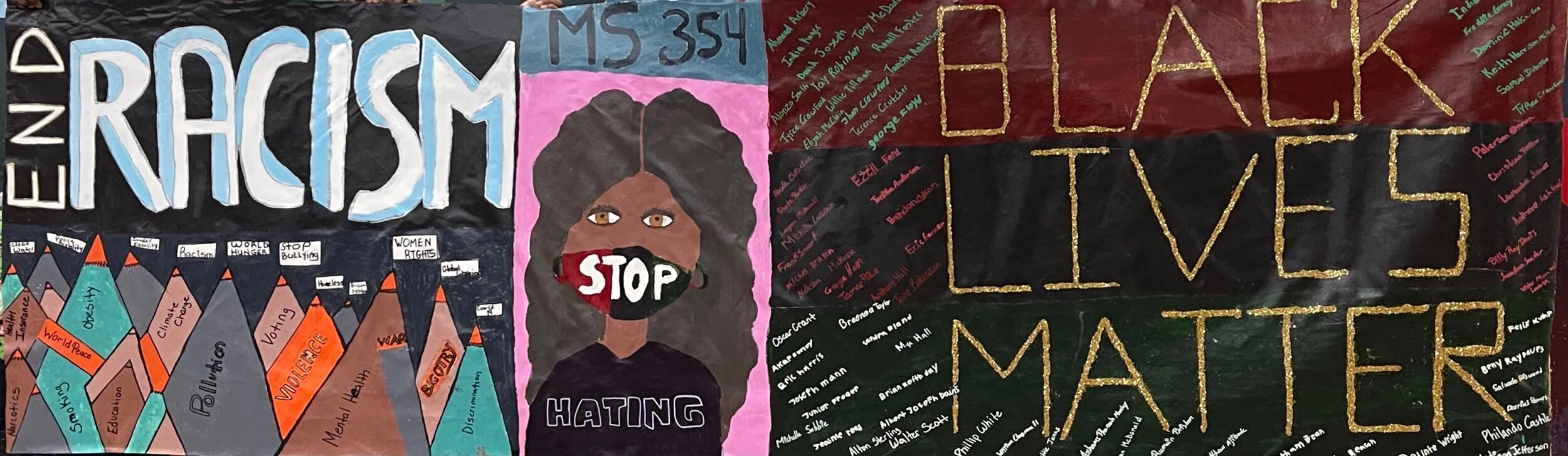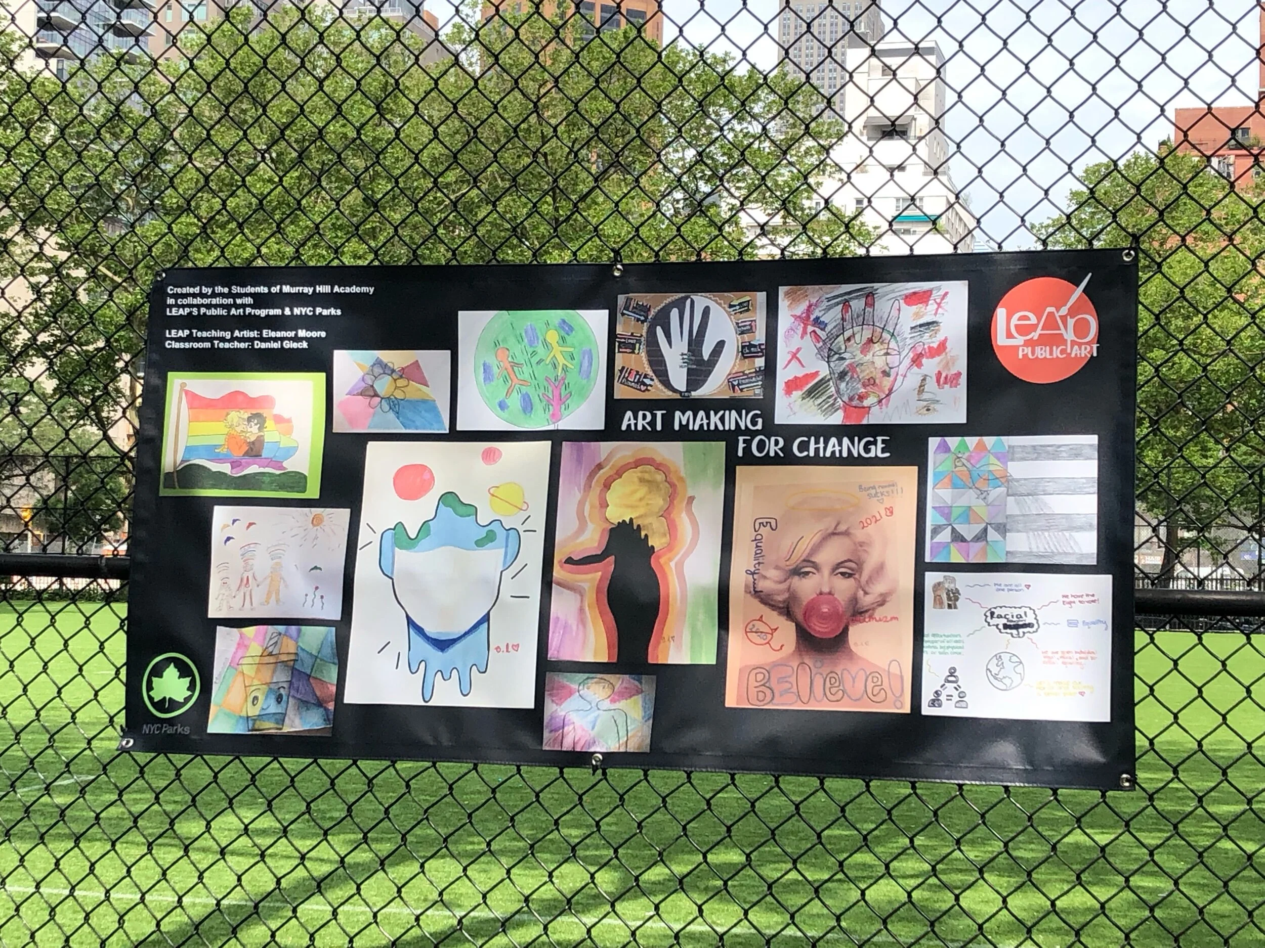 1 Mesh screen with social justice-themed artwork from Murray Hill Academy /2021/ about 9 x 30 feet. As part of a public Art Residency with Murray Hill and a Parks Department collaboration. Banner is on view from June-September 2021 in St. Vartan Park, NYC. Students contributed works virtually, exploring themes of pandemic effects, environmental awareness, racial inequality, and consumerism. This public display is the fruition of 9 asynchronous public Art lessons, focusing primarily on local murals.