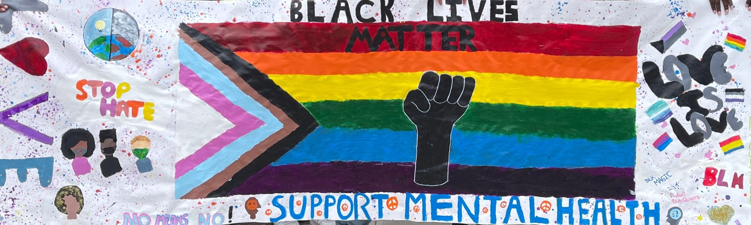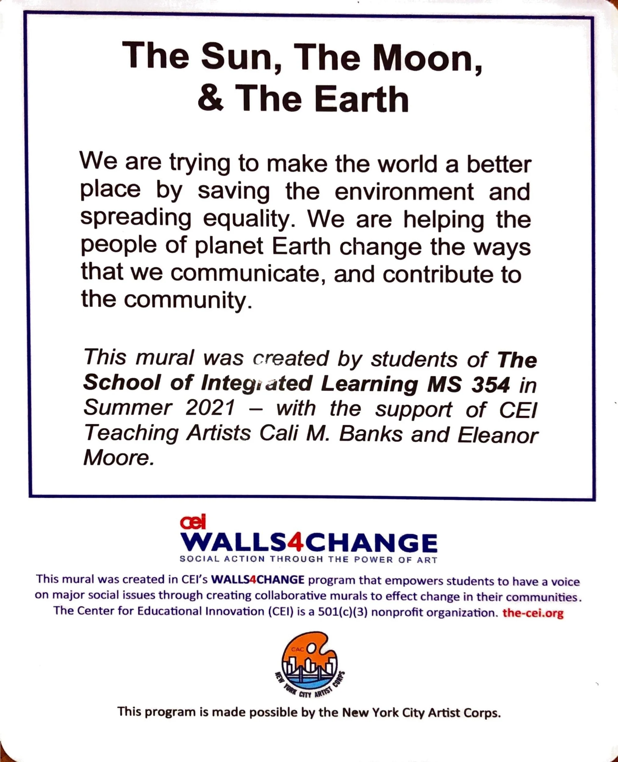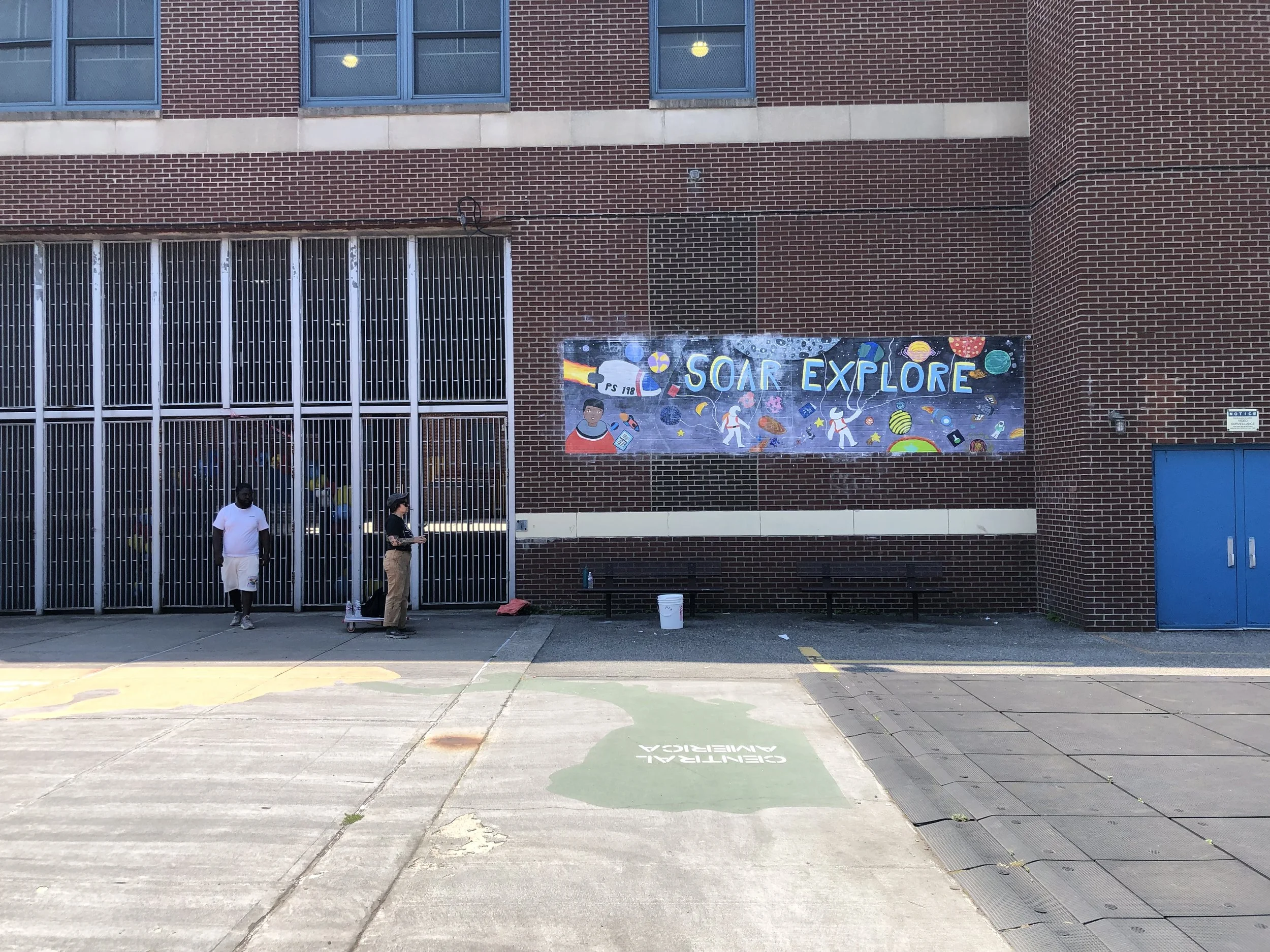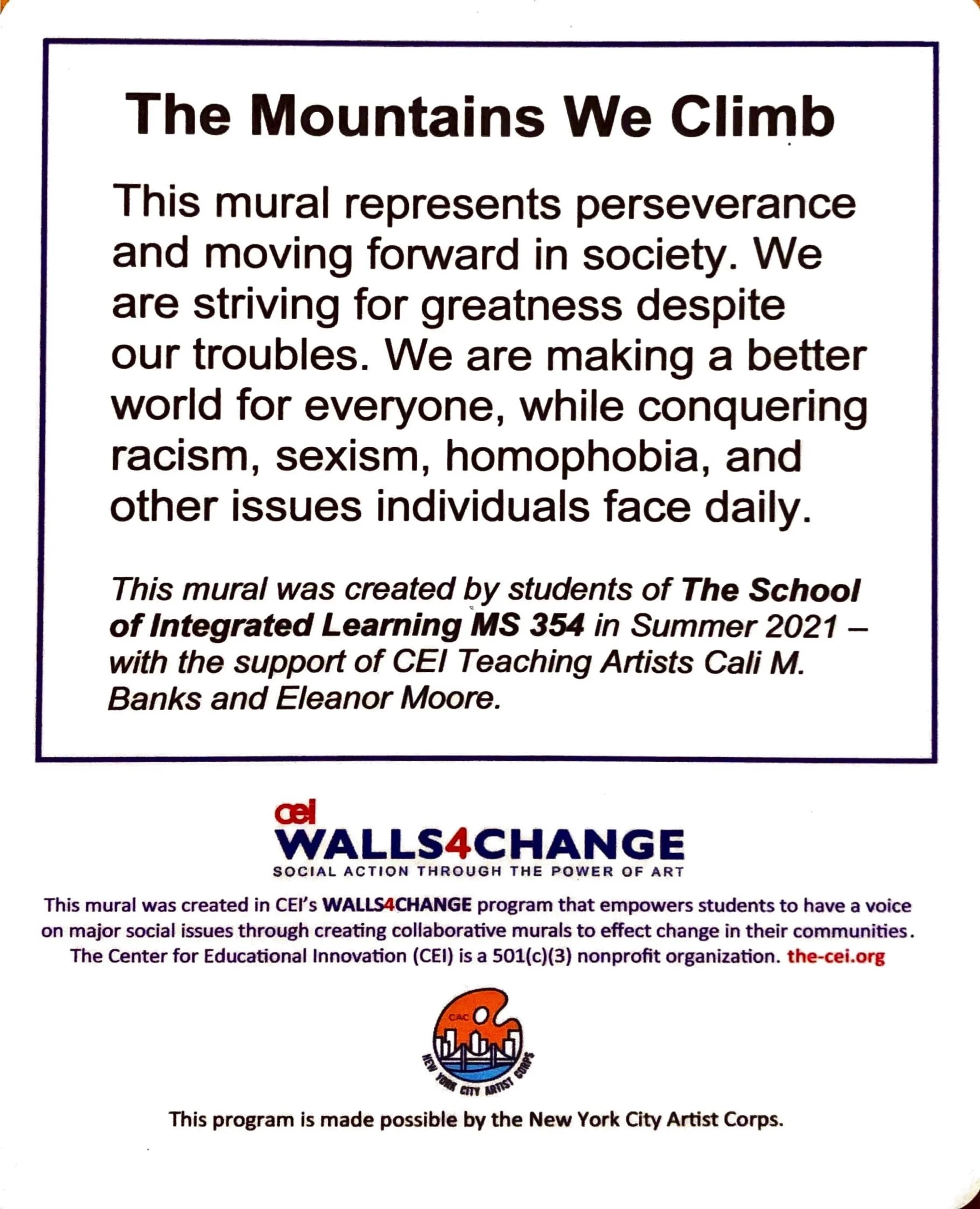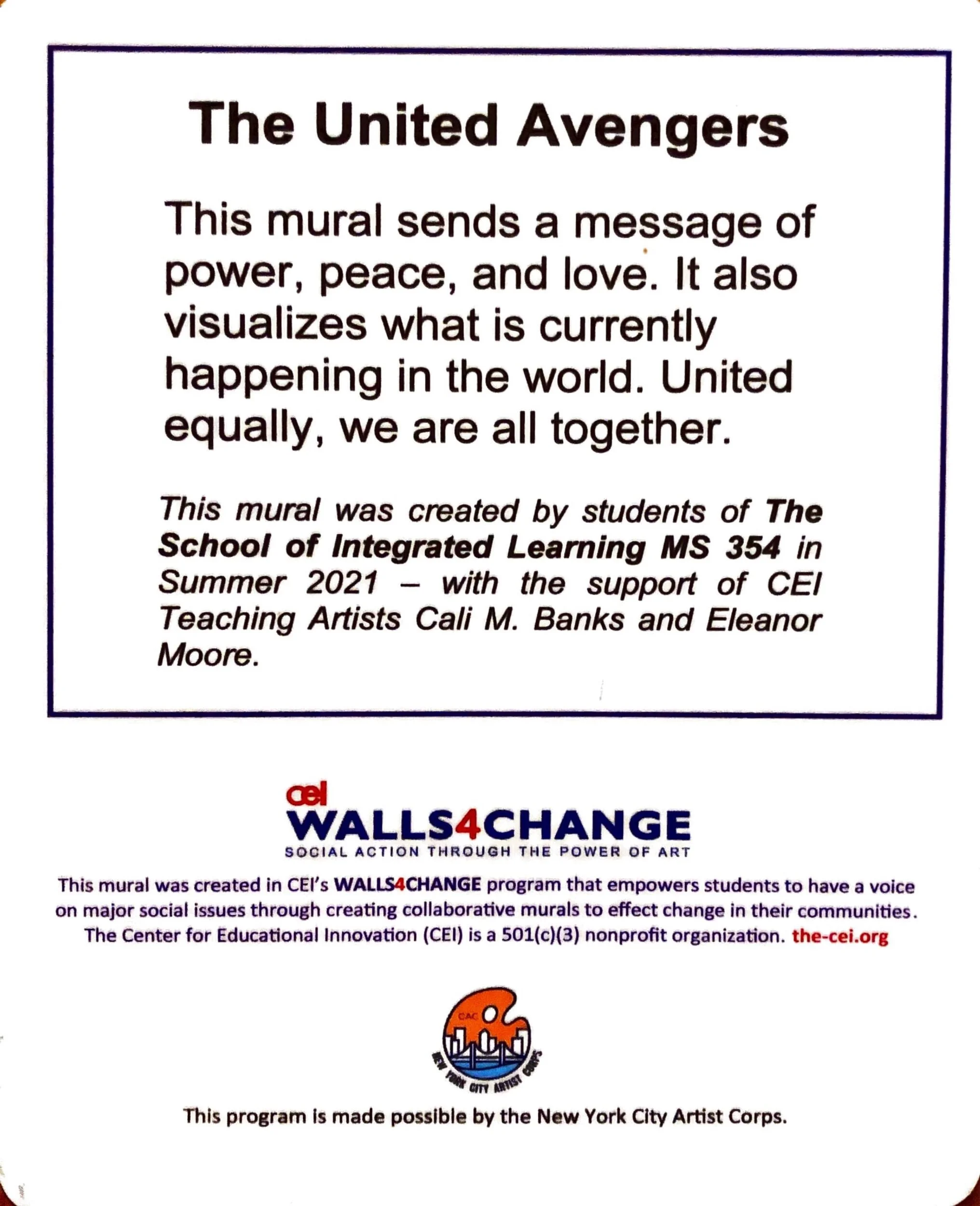 1 Mesh screen with social justice-themed artwork from Murray Hill Academy /2021/ about 9 x 30 feet. As part of a public Art Residency with Murray Hill and a Parks Department collaboration. Banner is on view from June-September 2021 in St. Vartan Park, NYC. Students contributed works virtually, exploring themes of pandemic effects, environmental awareness, racial inequality, and consumerism. This public display is the fruition of 9 asynchronous public Art lessons, focusing primarily on local murals.