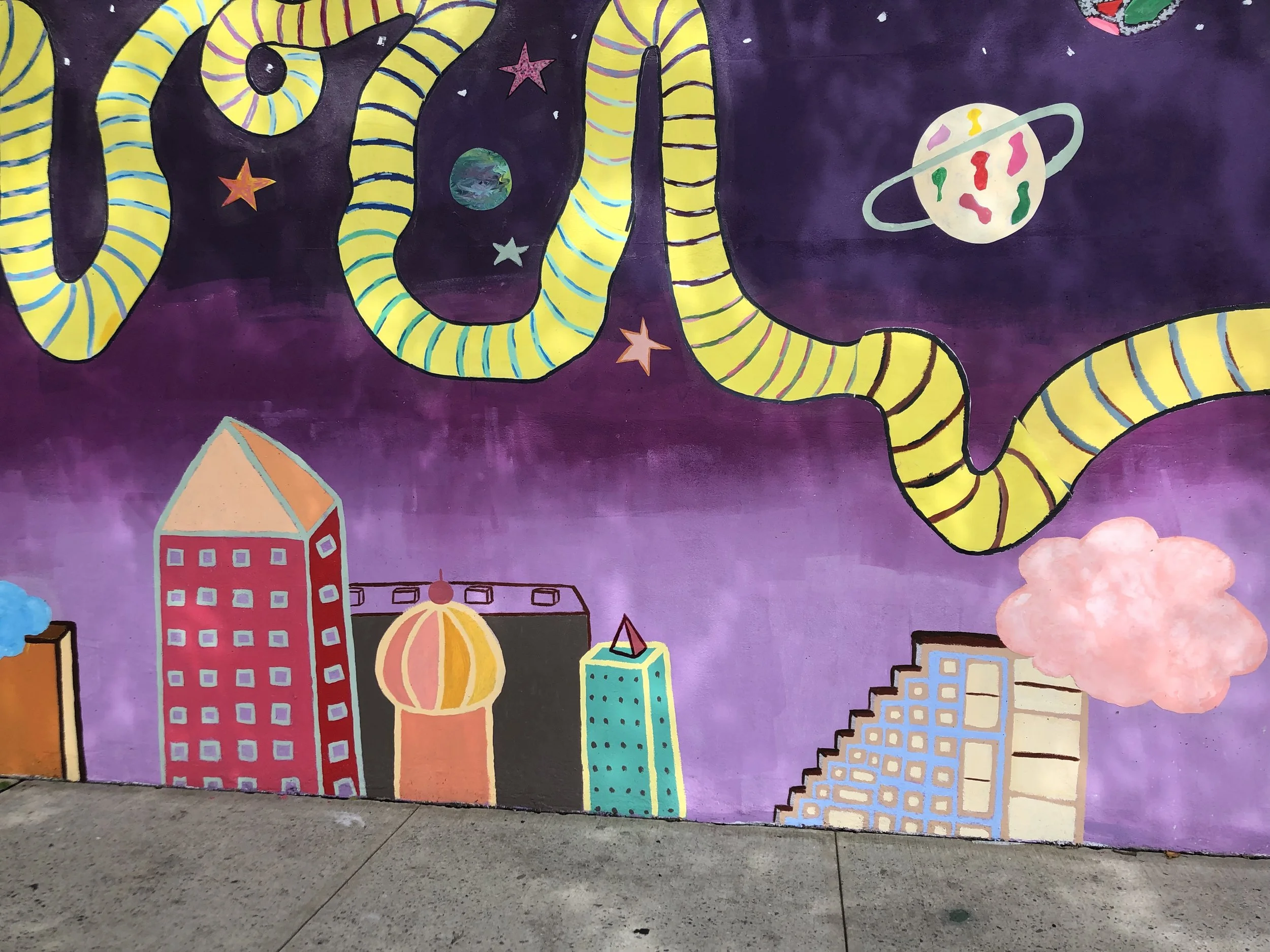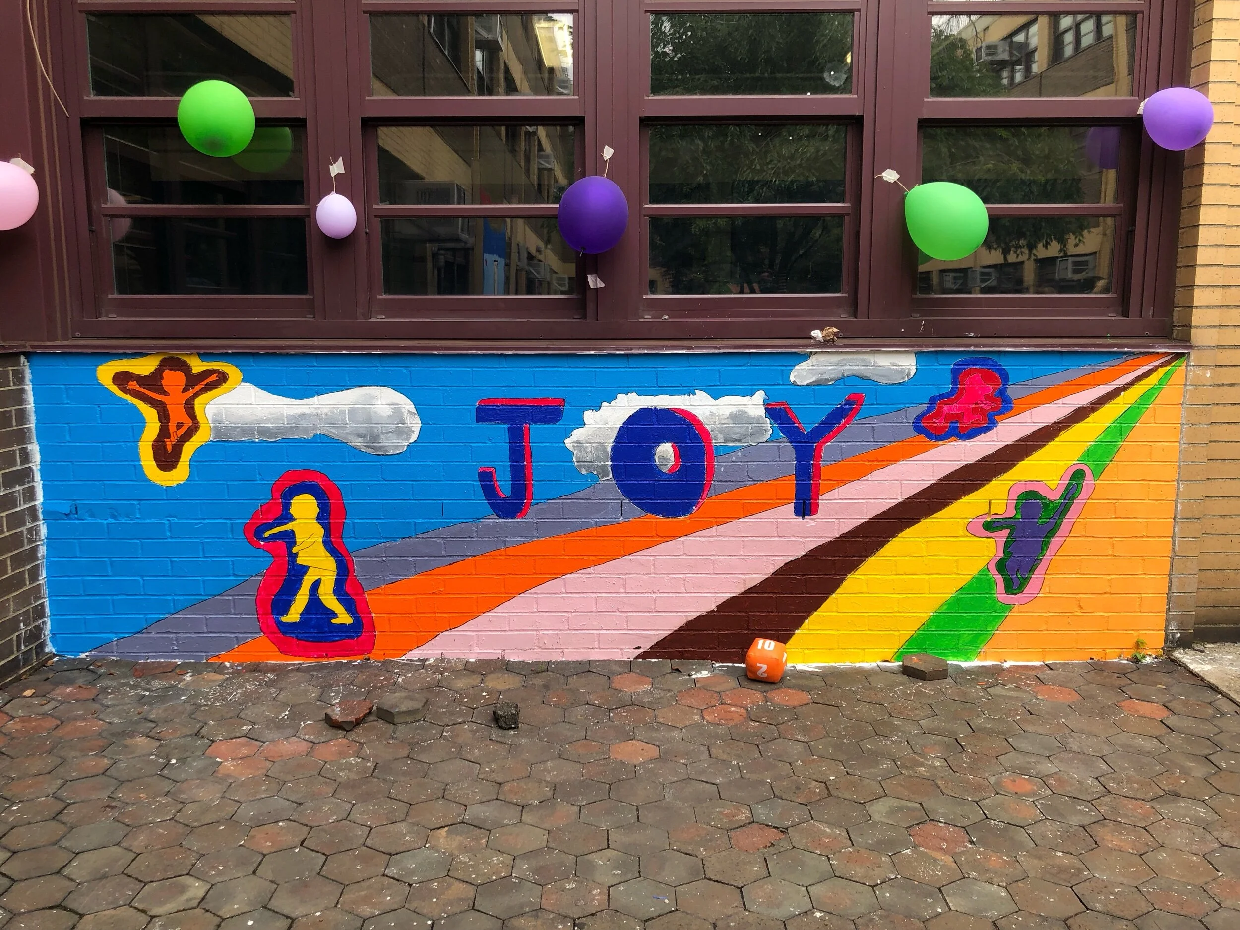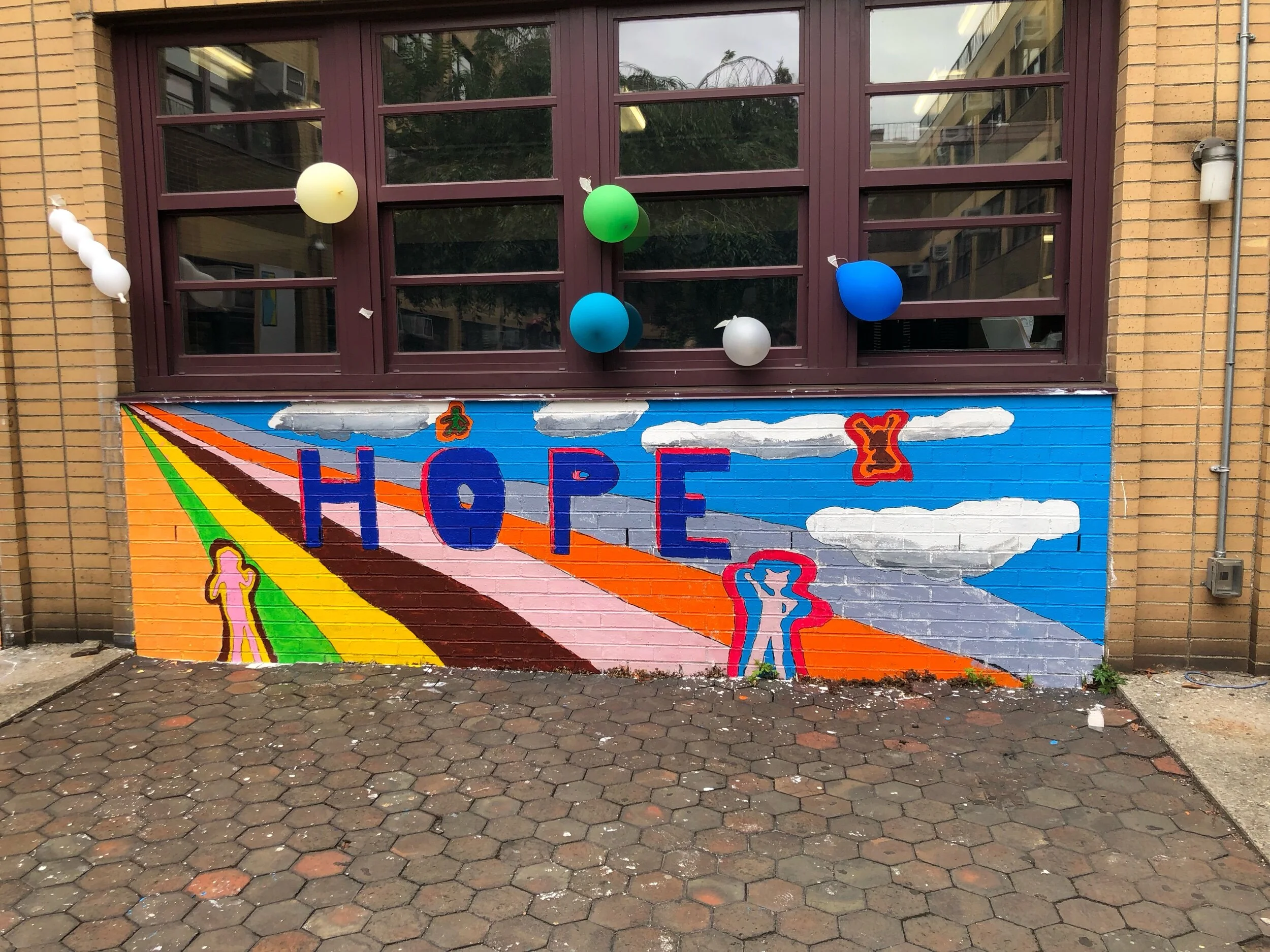 2 painted murals on brick/ 2021/ 12 ft 10” x 3ft 6” each. Collaborative project with students at Juan Morel Campos, Brooklyn, NY. Students and school administration requested positive and uplifting imagery. Each of the figures represents one of the students, and we went out of our way to make deliberate color choices as a team. Artist mural made possible with a grant from the New York City Artist Corps and the Office of Arts and Special Projects