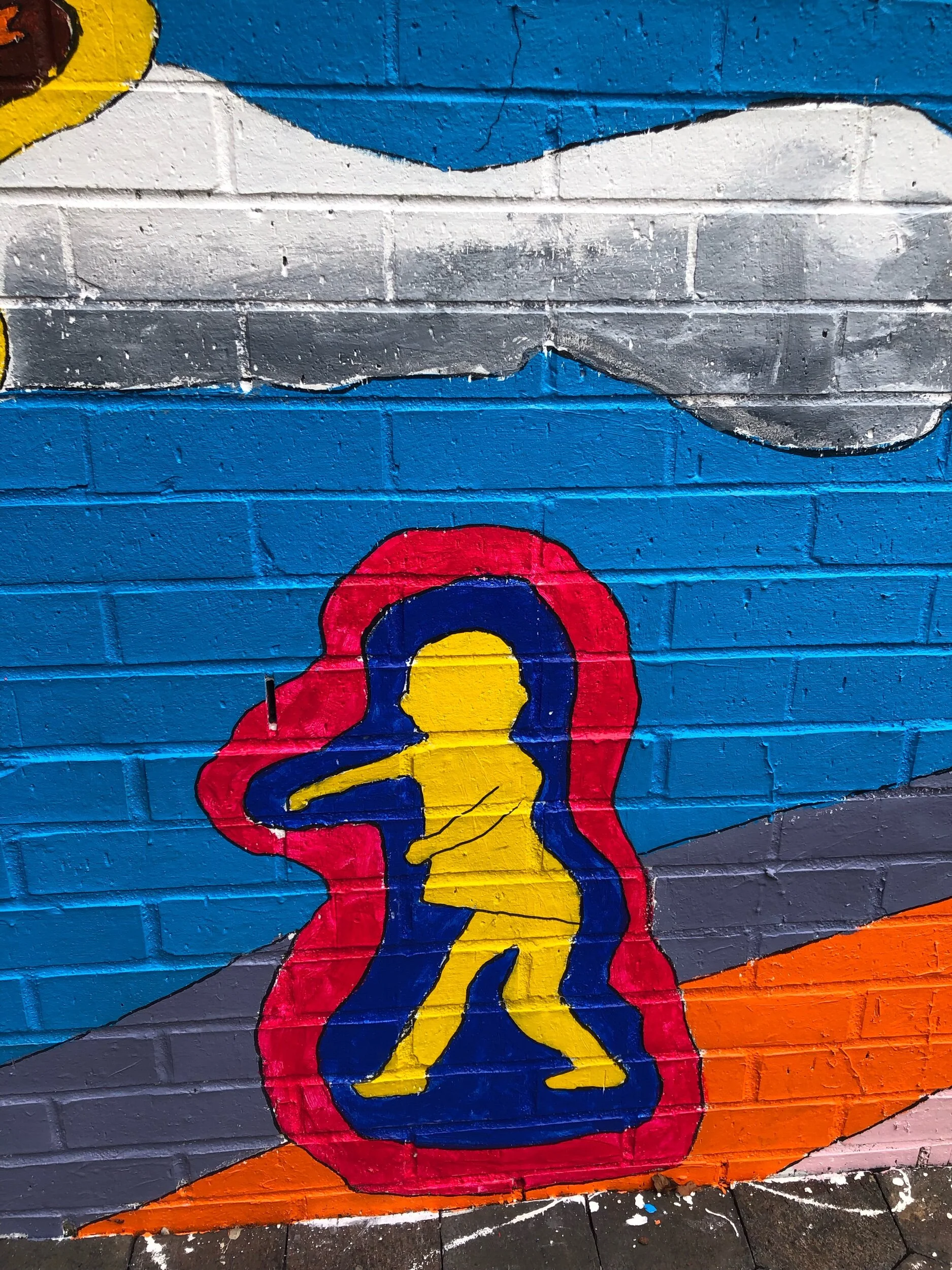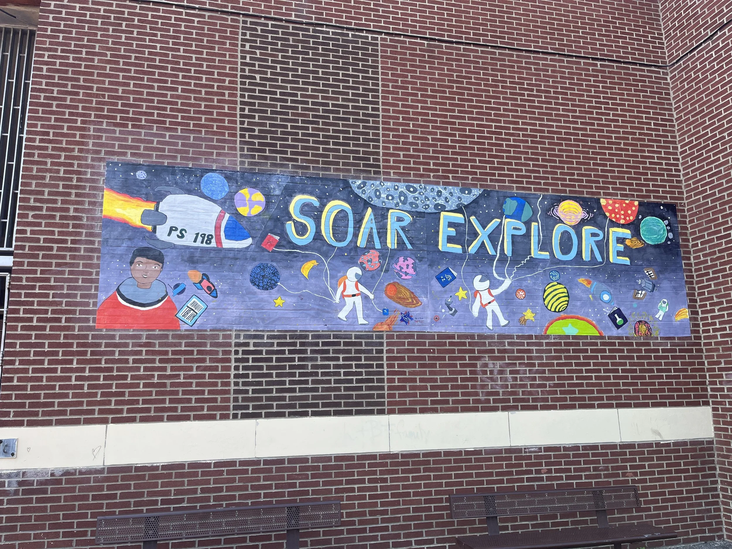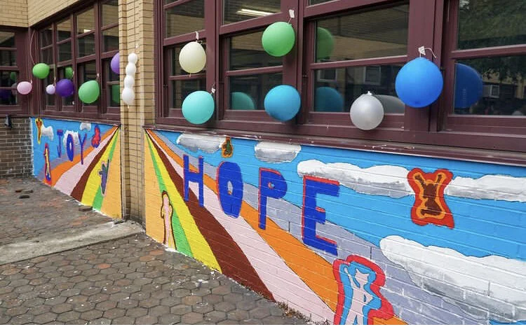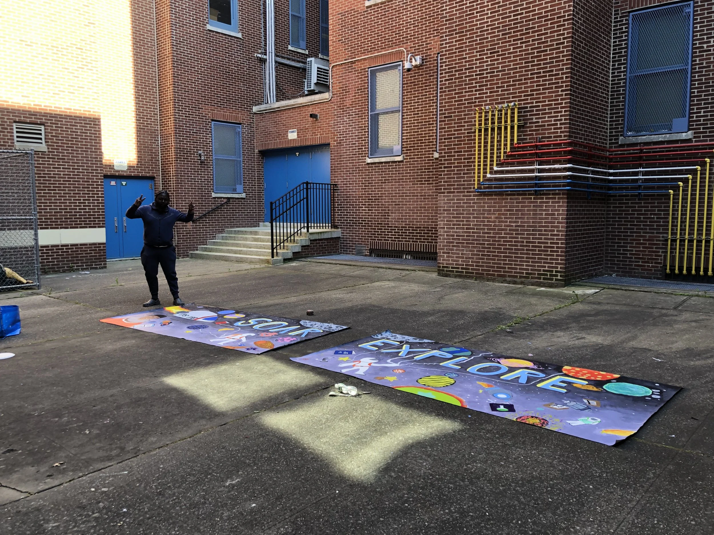 2 painted murals on brick/ 2021/ 12 ft 10” x 3ft 6” each. Collaborative project with students at Juan Morel Campos, Brooklyn, NY. Students and school administration requested positive and uplifting imagery. Each of the figures represents one of the students, and we went out of our way to make deliberate color choices as a team. Artist mural made possible with a grant from the New York City Artist Corps and the Office of Arts and Special Projects