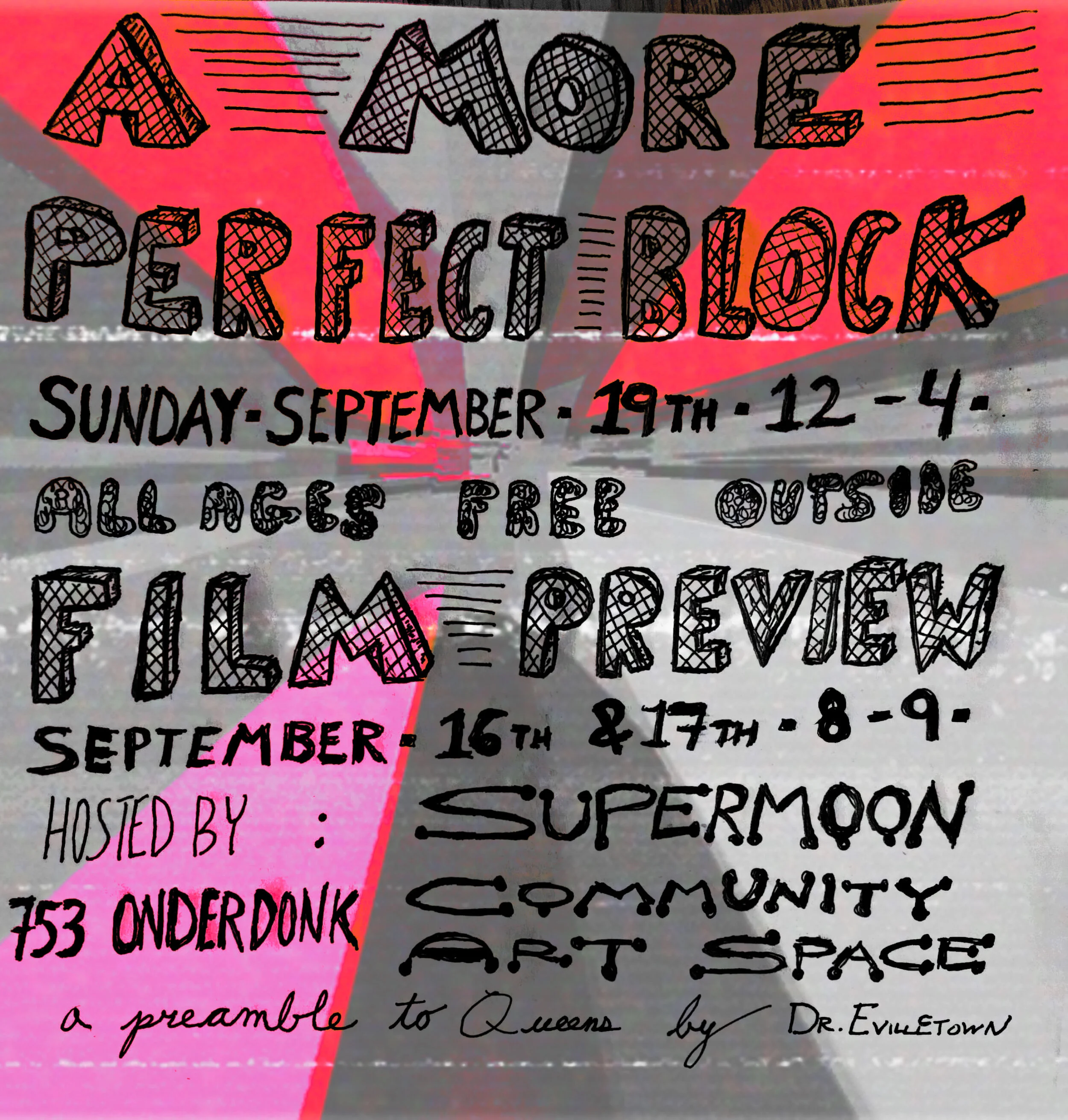 09.16, 09.17 a silent version of thr neighborhood - driven film, 𝐴 𝑀𝑜𝑟𝑒 𝑃𝑒𝑟𝑓𝑒𝑐𝑡 𝐵𝑙𝑜𝑐𝑘 was projected out of a window at the supermoon satellite space. This public installation ran for one hour, between 8-9pm. Closing out Bushwick Open Studios on 09.19, an interactive installation associating the neighborhood to the preamble to the constitution was visited by about 100 different people of all ages, through out the course of 12-4pm. This project was made possible by a generous grant from NYFA, Made in NYC, NYC Cultural Affairs, and the Queens Theatre