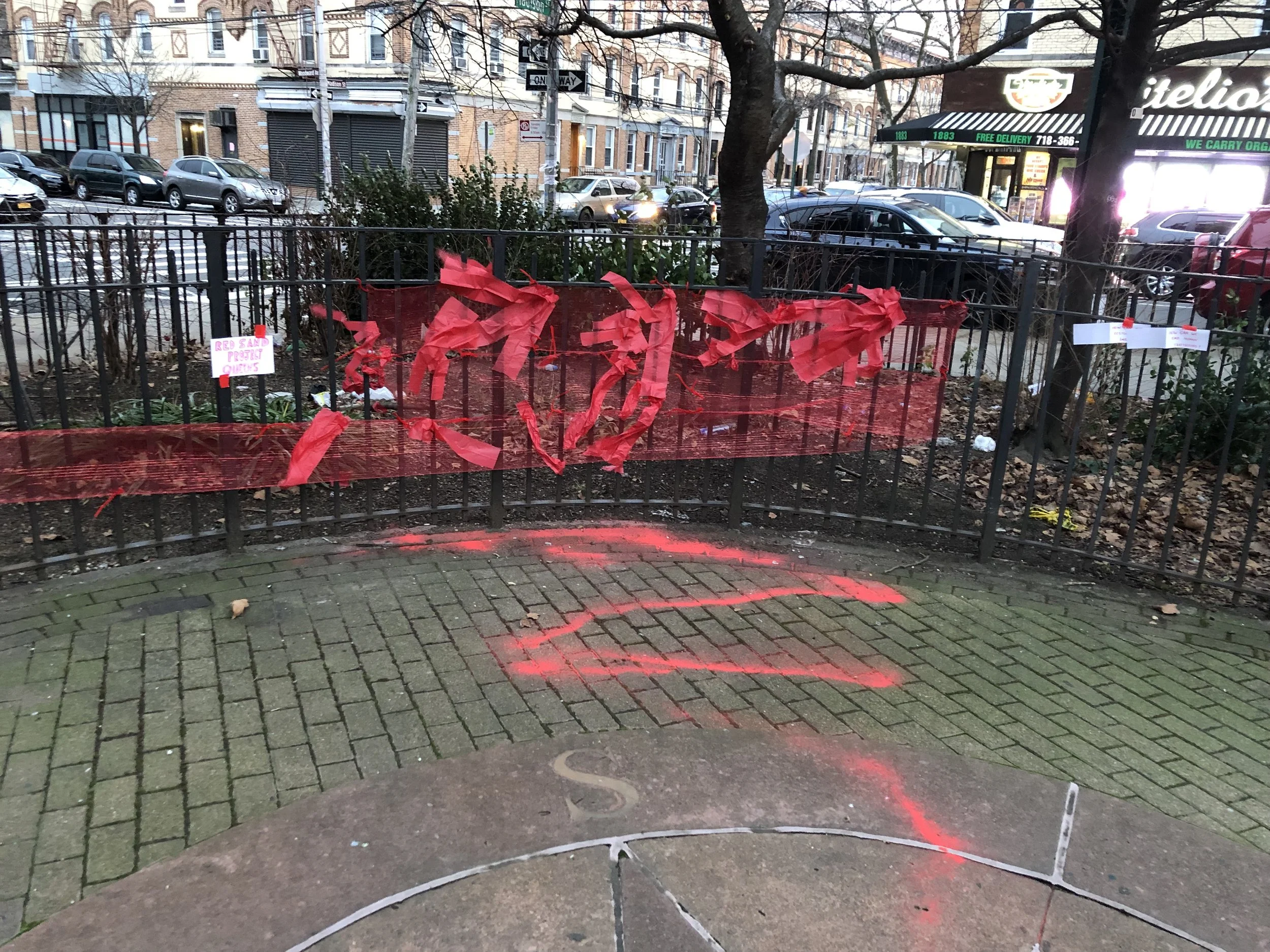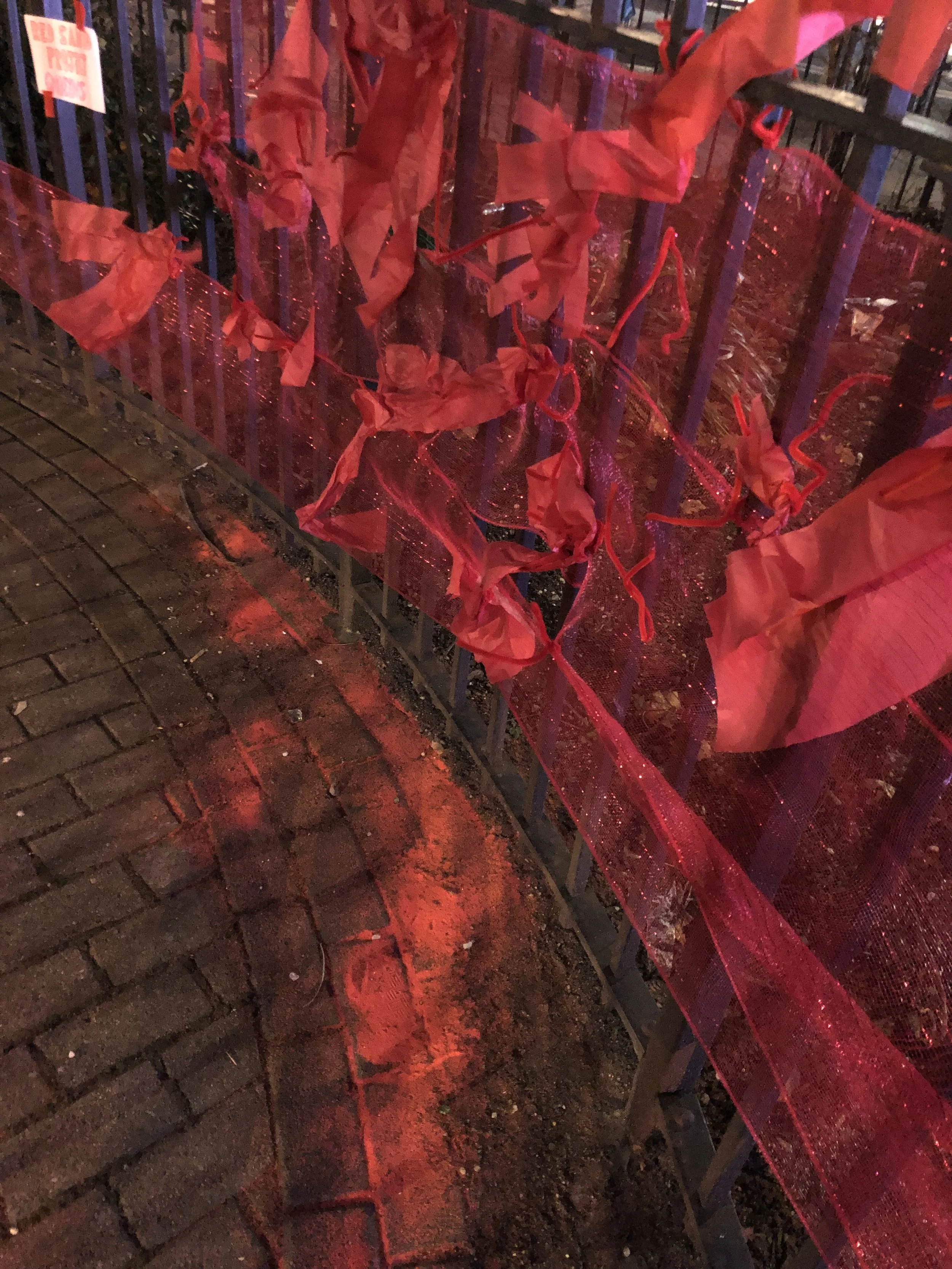 Sand Project as part of a continuation of sidewalk installations created by artist, Molly Gochman, the Red Sand Project brings community attention to human trafficking. Our Queens neighborhood was particularly taken with marginalized people, and a porous fabric was chosen to emulate Molly’s use of cracks in the sidewalk. Due to extremely windy conditions participants added and affixed paper and textiles to the work using pipe cleaners.
