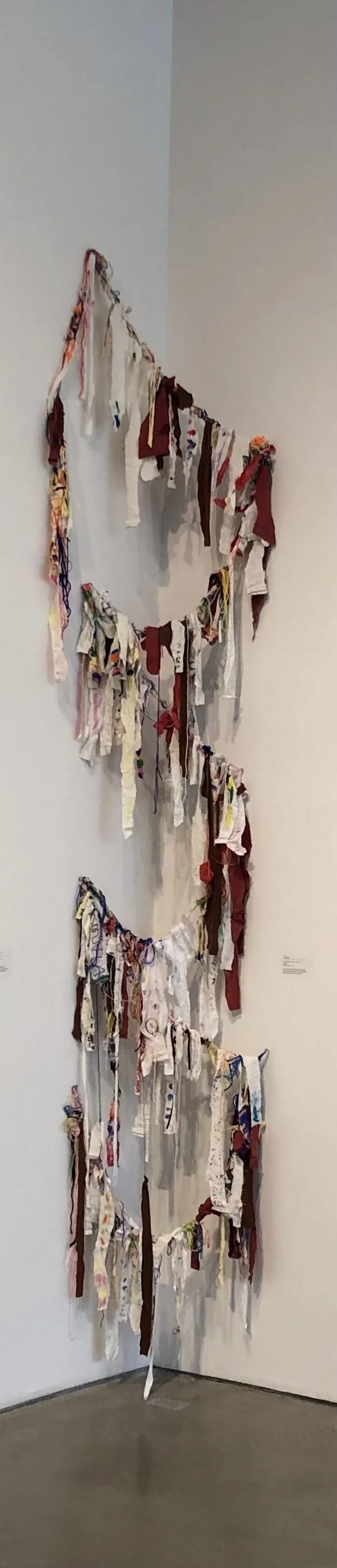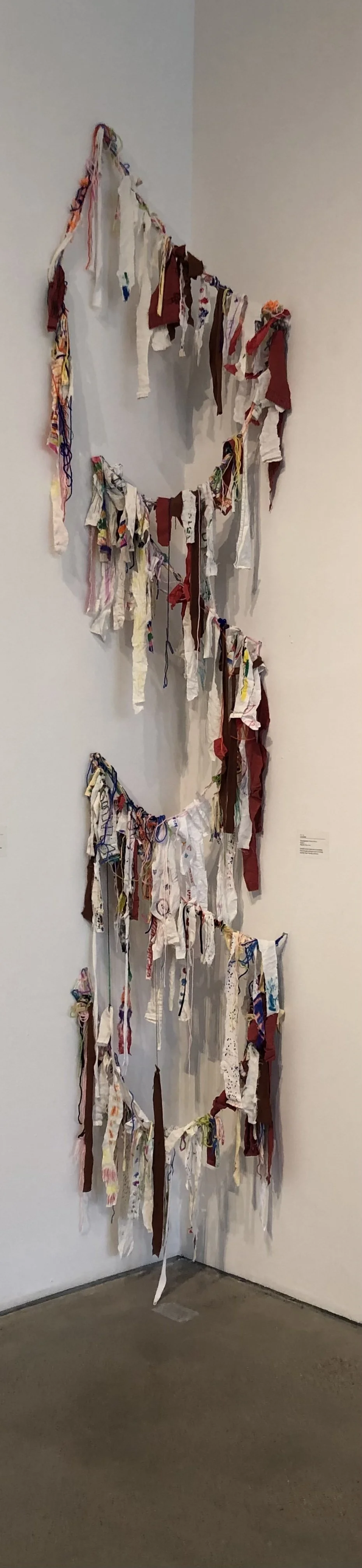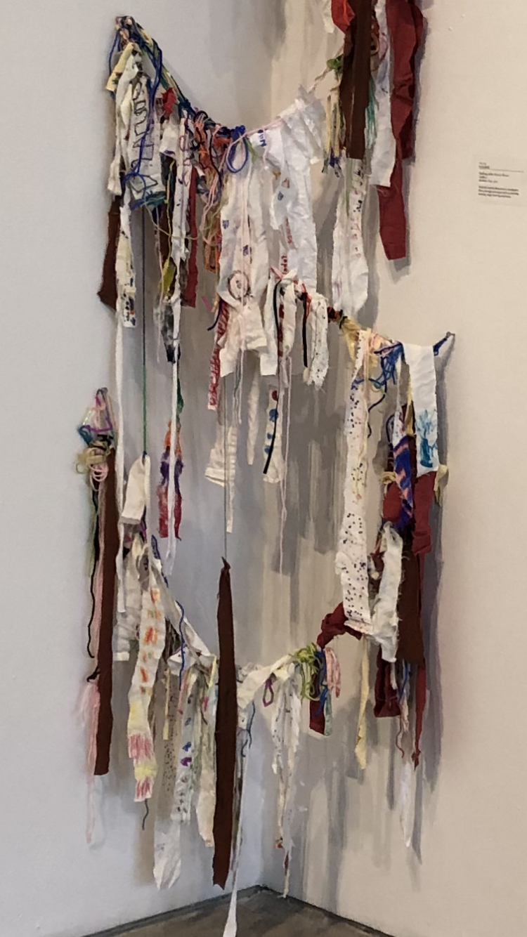 Fiber Arts Collaboration with first grade students from PS 115, Canarsie, Brooklyn. Made of recycled fibers including cotton, acrylic, angora, and nylon, embelished with markers and knotting techniques. On display at BRIC, fulton street, NYC May 2022