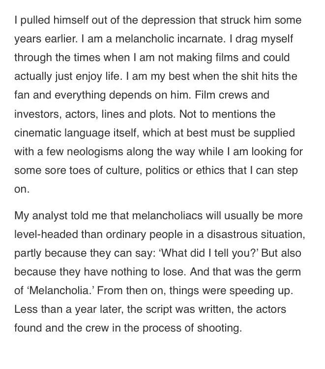 Pre pandemic: Living and working with a sort of bottomless despair, due mostly in part to forces out of my control. Getting slowly crushed by this gargantuan boulder. Post pandemic: the social acceptance of these types of feelings are expected and welcome. Like I got to class 20 min early.. I read at one point that Lars von trier had a theory relating to tragedy and depression, that depressed people can cope more successfully with these earth shattering events.